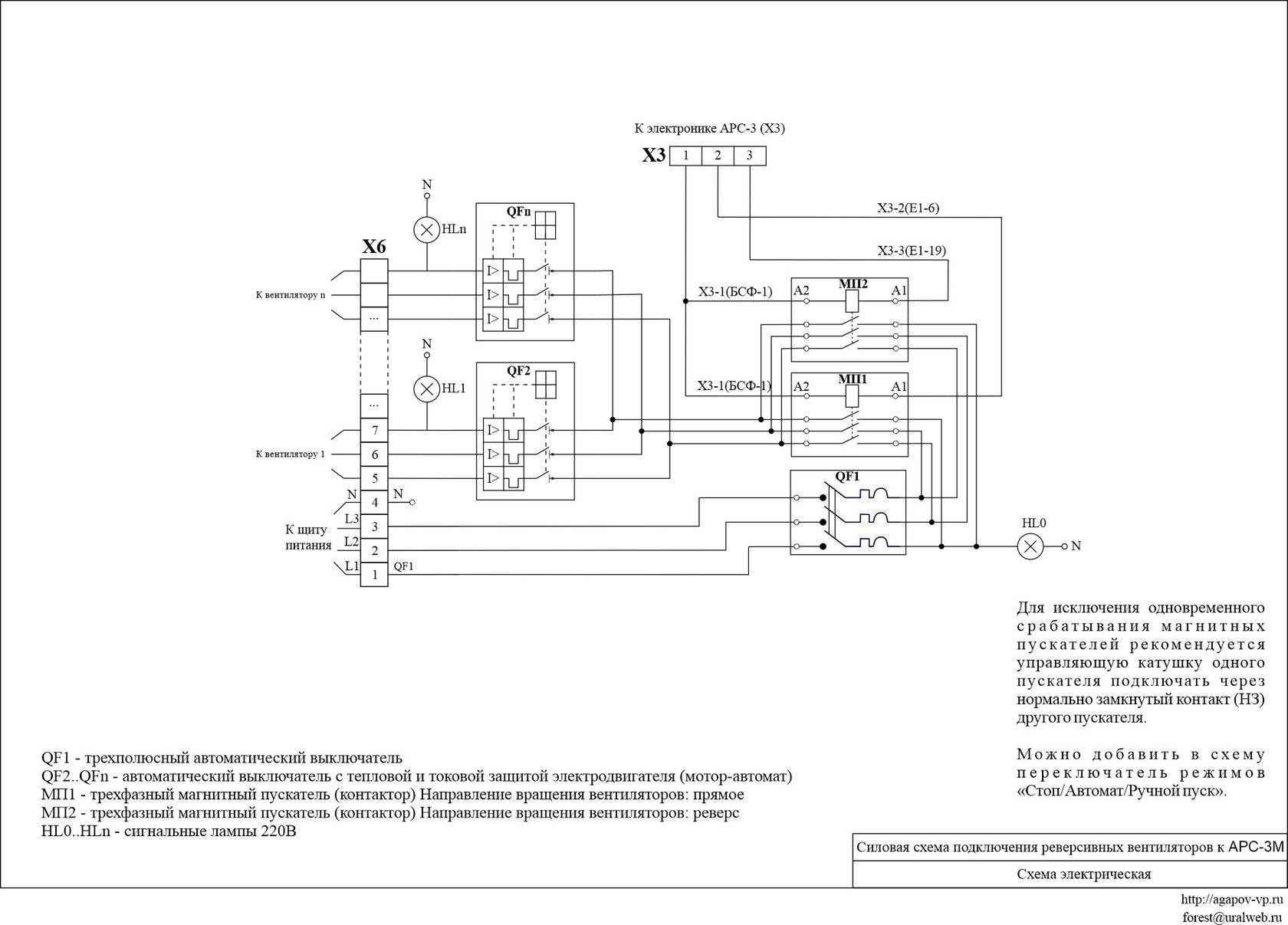 Электродвигатель каждого вентилятора подключается через мотор-автомат (QF2-QFn) для защиты от перегрузок, коротких замыканий, проблем с фазами и т.п.