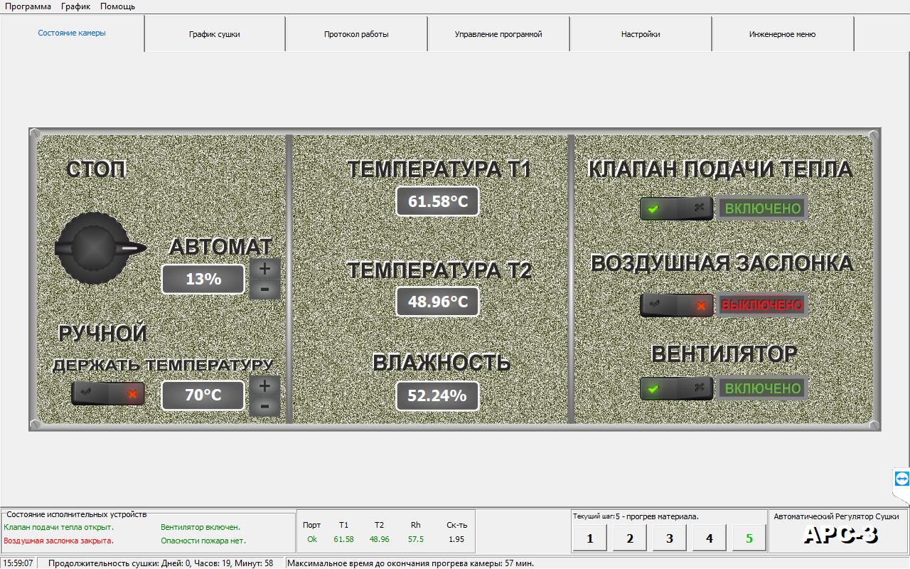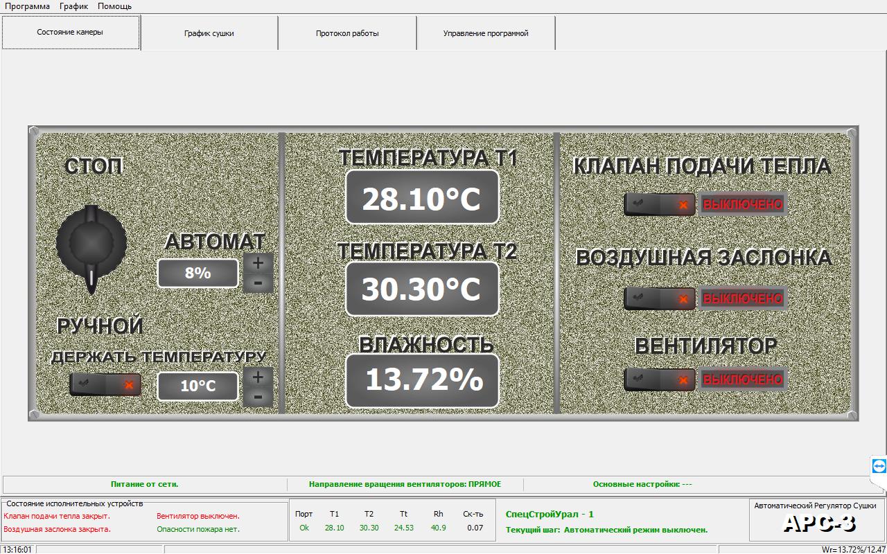 - Режим «РУЧНОЙ» - каждым исполнительным устройством можно управлять вручную, либо включить полуавтоматическую систему поддержания заданной температуры в камере, например для предотвращения разморозки системы подачи воды в зимний период. В режиме поддержания заданной температуры, вручную можно управлять только открытием/закрытием воздушной заслонки.