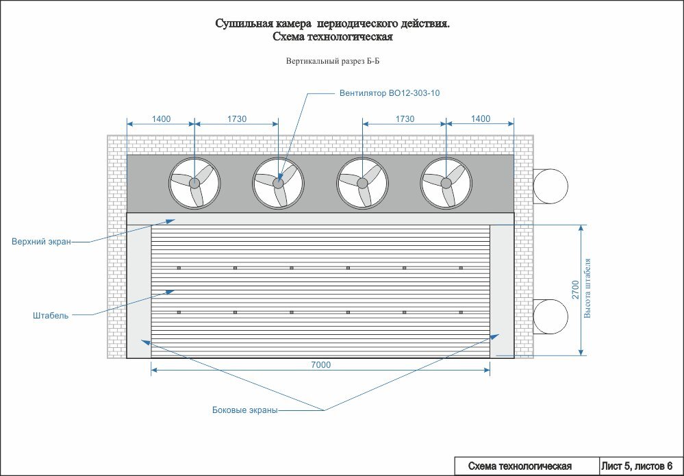 Технологическая схема - это комплект чертежей камеры в разных проекциях и сечениях с размерами и взаимным расположением технологического оборудования. Чертеж не такой детальный, как рабочий проект, там нет шурупов, петель, и т.п. мелких деталей. Но этого вполне достаточно чтобы построить правильную сушильную камеру.